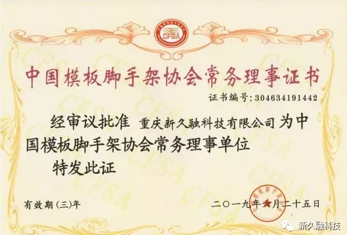 熱烈祝賀重慶新久融科技榮獲中國模板腳手架協(xié)會常務理事單位稱號2019年6月,新久融科技正式加入中國模板腳手架協(xié)會,并榮獲協(xié)會常務理事單位稱號。中國模板腳手架協(xié)會是國家一